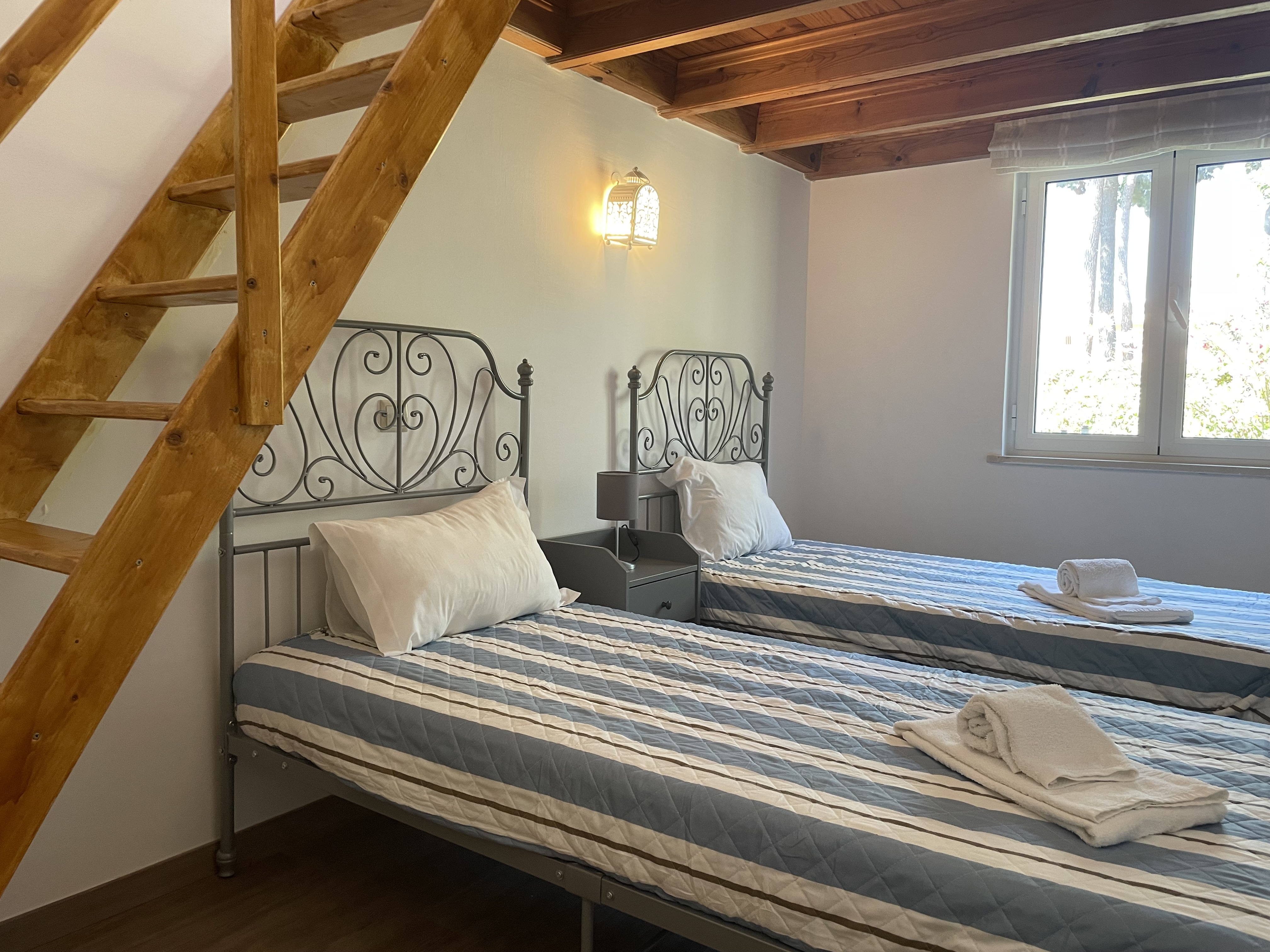 - one bedroom with a double bed, another bedroom with two single beds and a double bed on a mezzanine accessible by stairs;