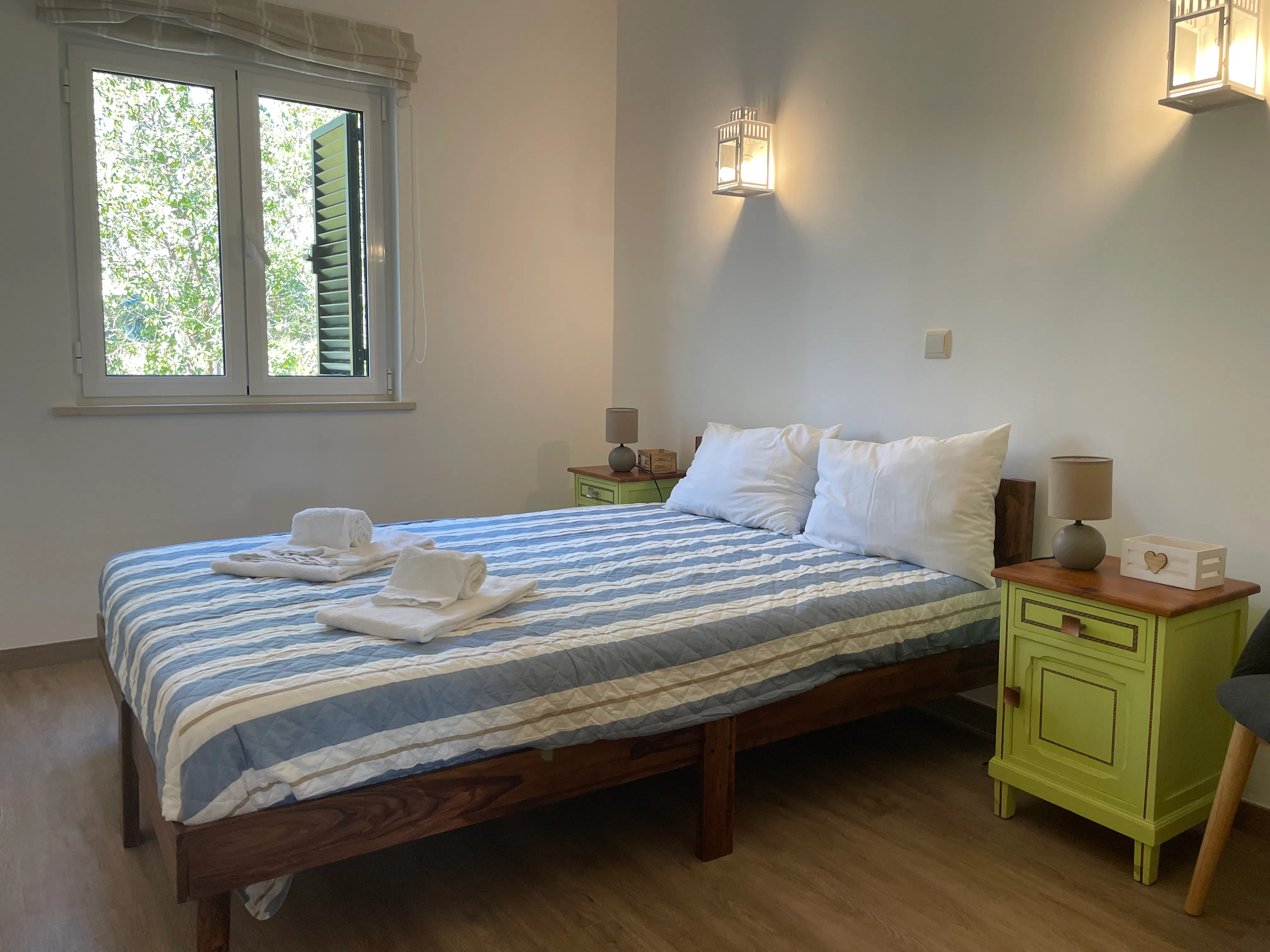 - one bedroom with a double bed, another bedroom with two single beds and a double bed on a mezzanine accessible by stairs;